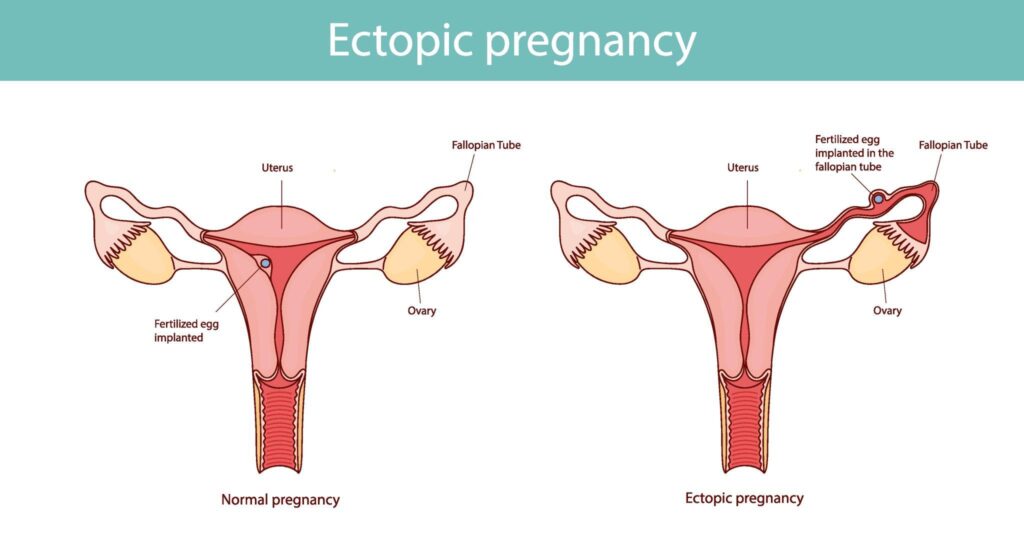 An ectopic pregnancy occurs when the fertilised egg develops outside the uterus. This condition is life-threatening if untreated.
